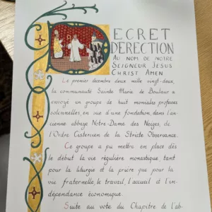 Installée depuis décembre 2022 à l’abbaye Notre-Dame des Neiges, notre communauté a vécu une étape importante de sa fondation le dimanche 28 décembre. Après trois années en ce lieu durant lesquelles nous étions sous la dépendance canonique de notre abbaye mère Sainte Marie de Boulaur (Gers), nous avons reçu le statut de prieuré autonome, suite à la demande du Pape Léon XIV en octobre dernier que soit signé le décret d’érection.